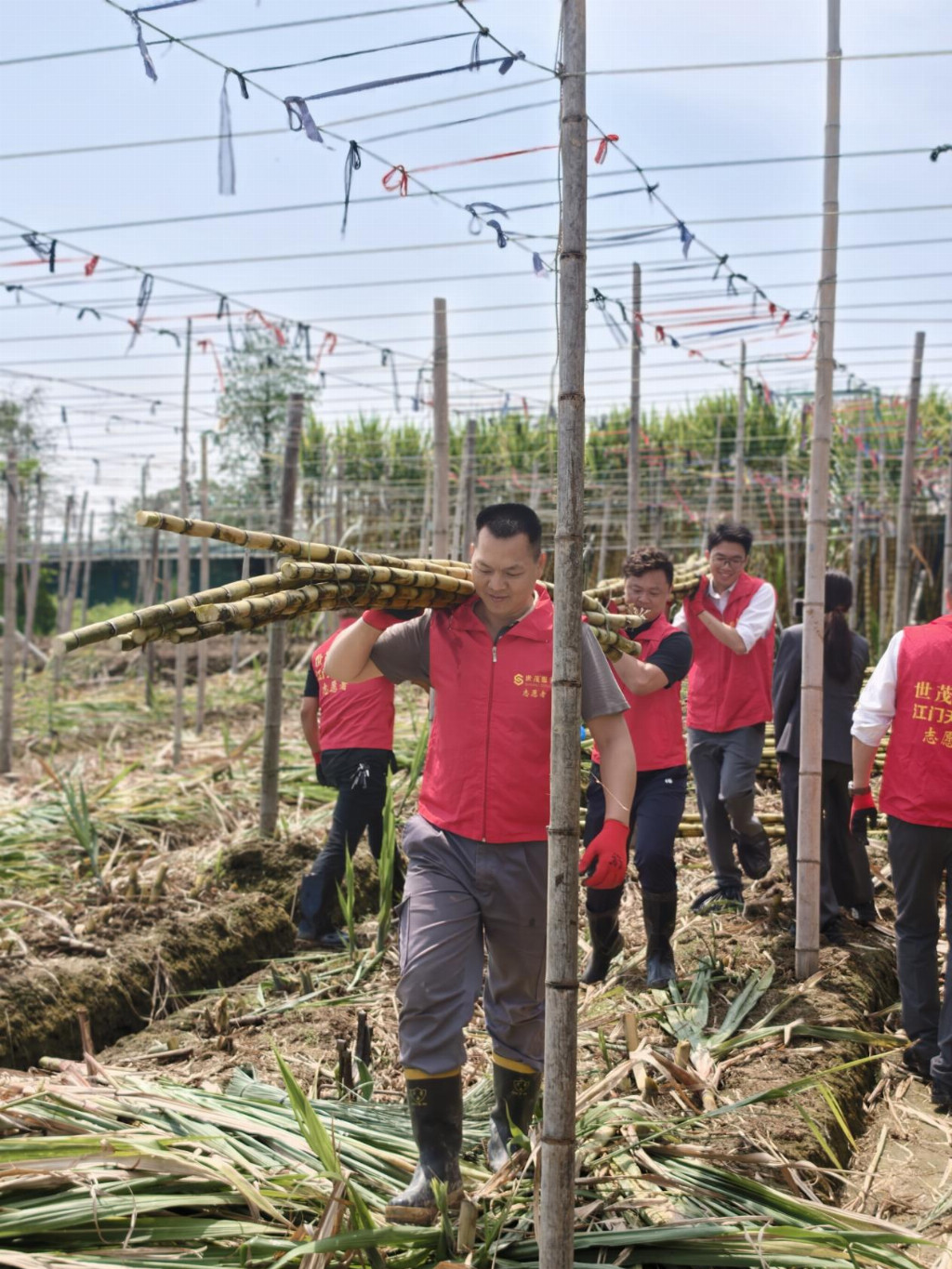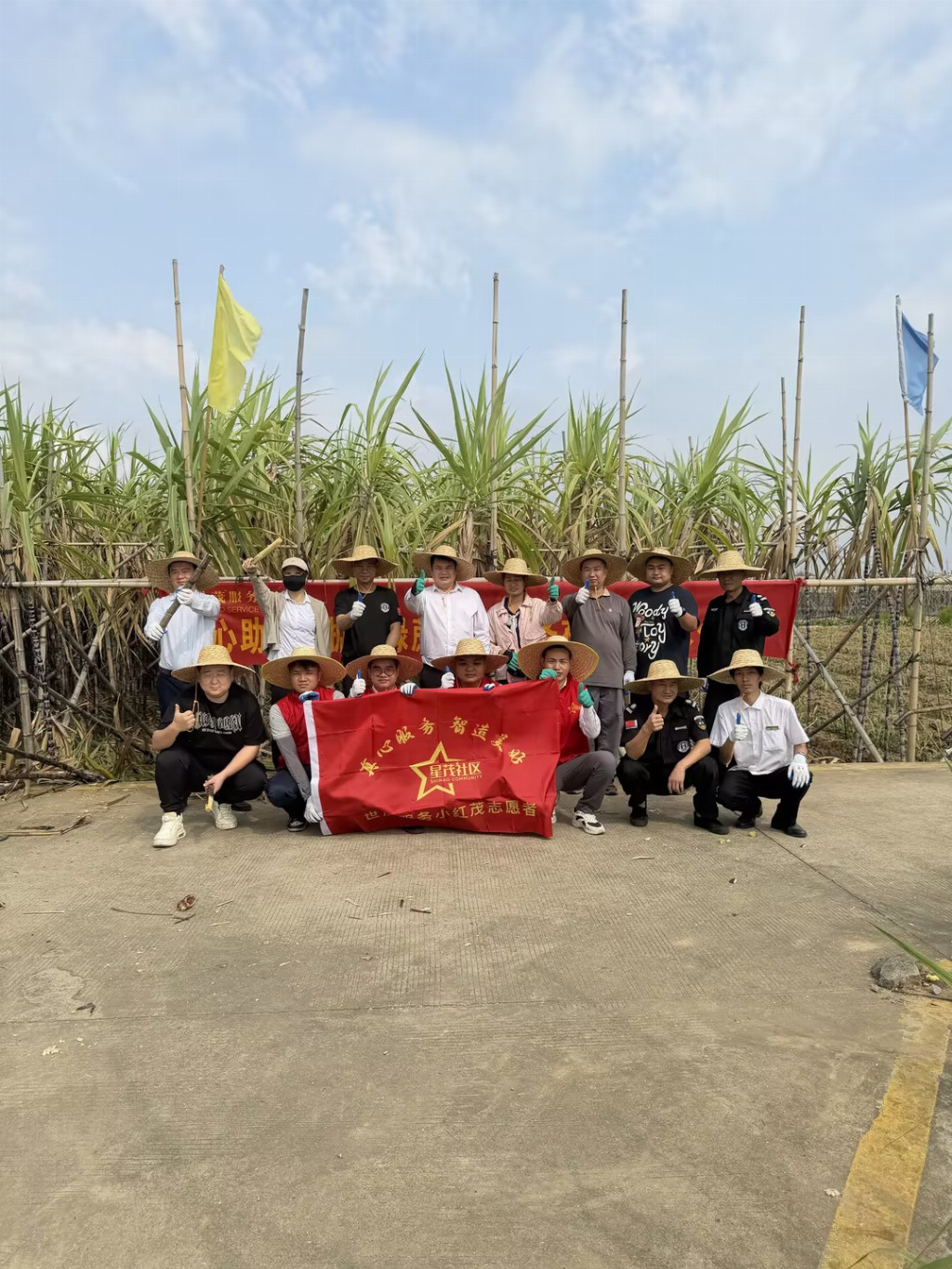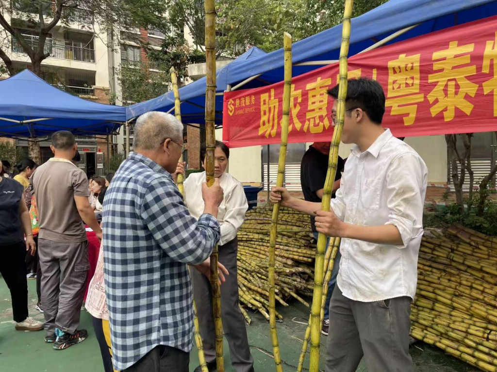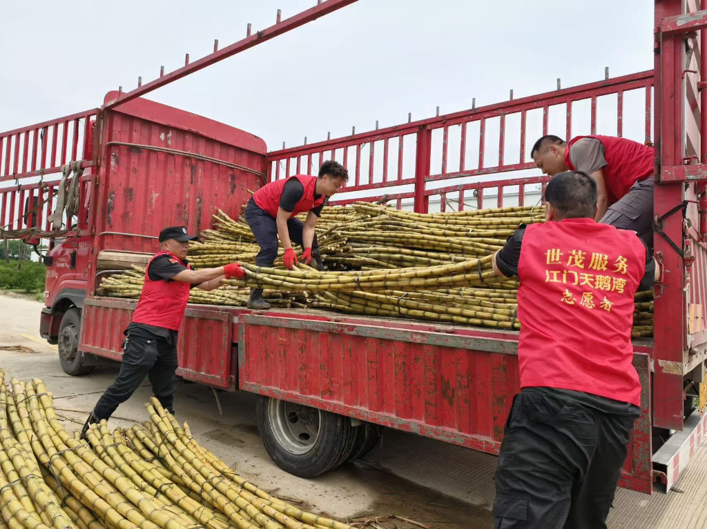 这场公益助农行动在世茂服务东南区域持续接力。世茂江门天鹅湾项目物业服务团队与业主志愿者共同驱车奔赴江门新会双水镇甘蔗地。