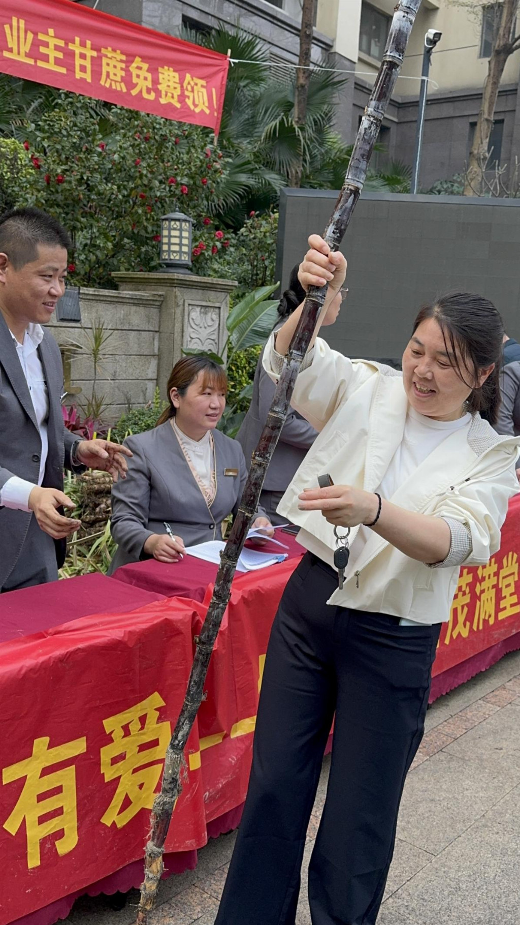 午后,满载爱心甘蔗的车辆驶回项目,管家们第一时间将这份浸润着泥土气息的甜蜜派送到业主手中。业主们有序排起长队,一边接过甘蔗,一边听着田间地头的助农故事,纷纷点赞:“这甘蔗格外甜,甜到了心坎里”!